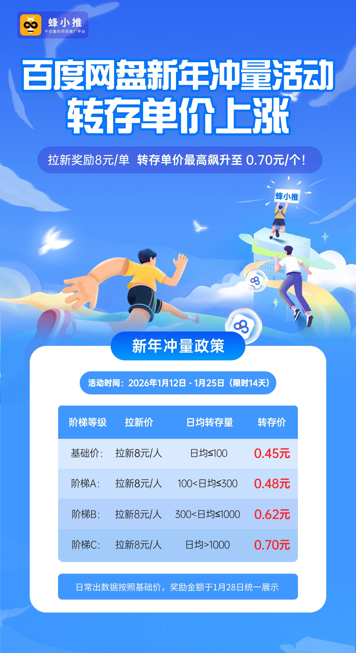 新年红利已到!1月12日起百度网盘开启限时两周冲量活动,拉新单价直逼8元,转存单价最高达0.7元。对推广达人来说,这不仅是短期福利,更是用每周更新资源撬动长期拉新的好时机,找准逻辑就能高效把握热度。