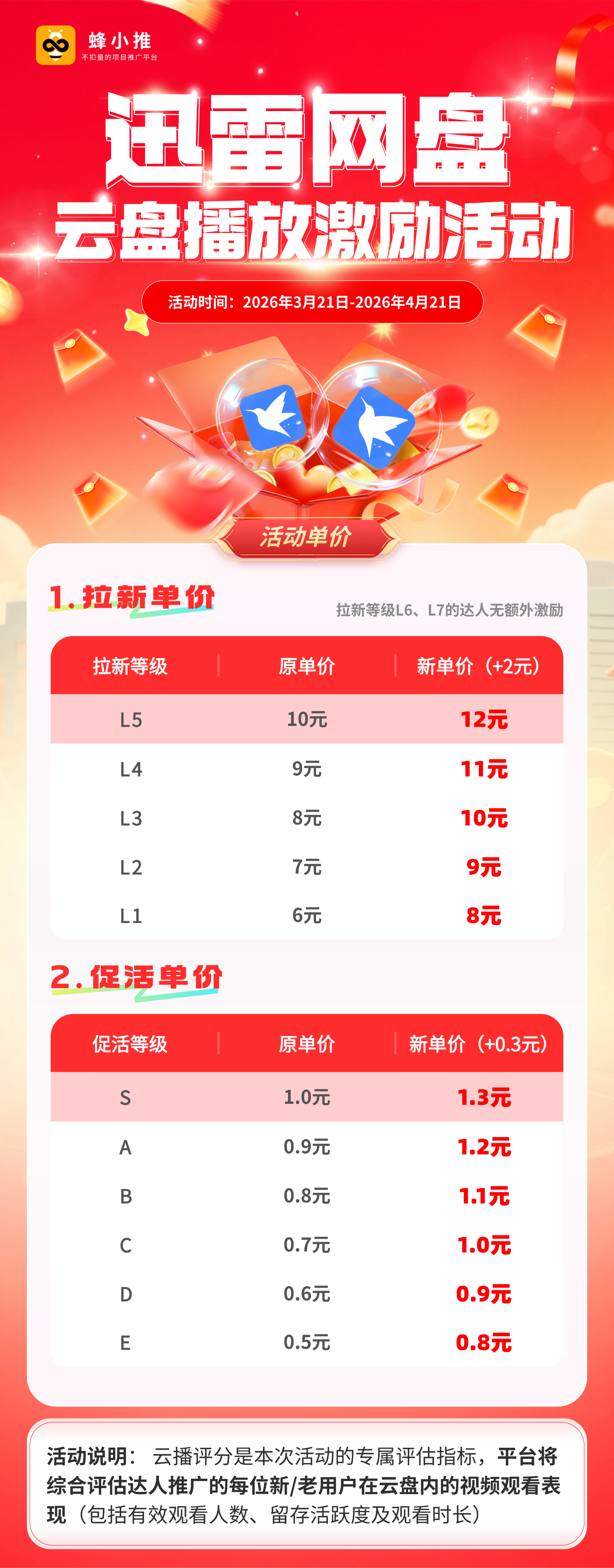 这次迅雷云盘播放激励活动,时间从3月21日到4月21日,整整一个月,专门为拉新量身打造。