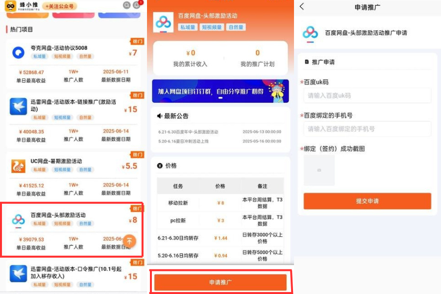 在项目列表中,找到“百度网盘拉新”相关项目;