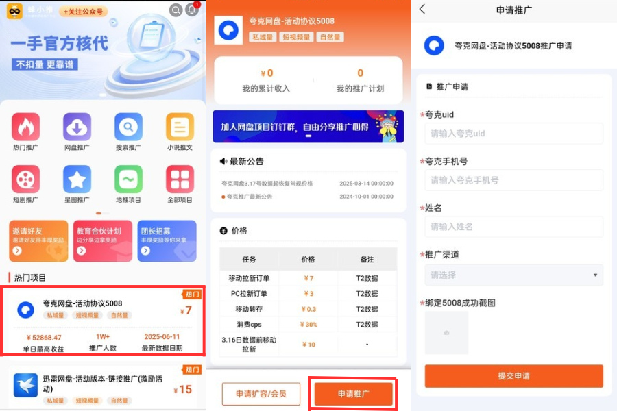 选择官方授权第三方平台(如蜂小推),下载APP完成账号认证,在“夸克网盘”项目申请推广资格生成专属链接,注意保护链接。通过平台后台查看数据优化策略,严格遵守平台规则,不夸大收益、不诱导注册,确保内容合法合规。