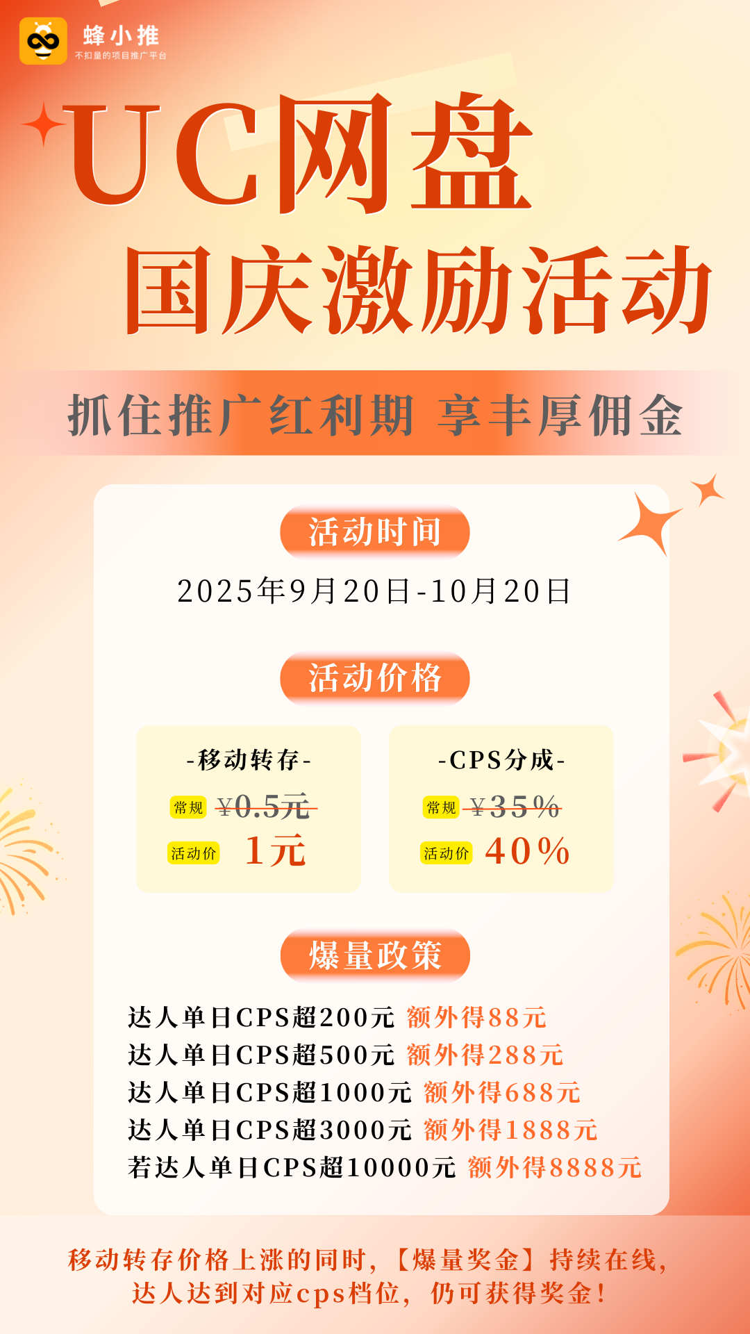 每逢重大节日,UC网盘为了抢占市场会推出限时激励活动。比如最近的国庆激励活动,移动转存奖励提升至1元,CPS分成高达40%。这种活动通常时间短暂但奖励丰厚,堪称推广的黄金窗口期。