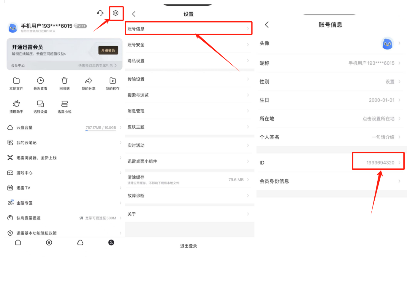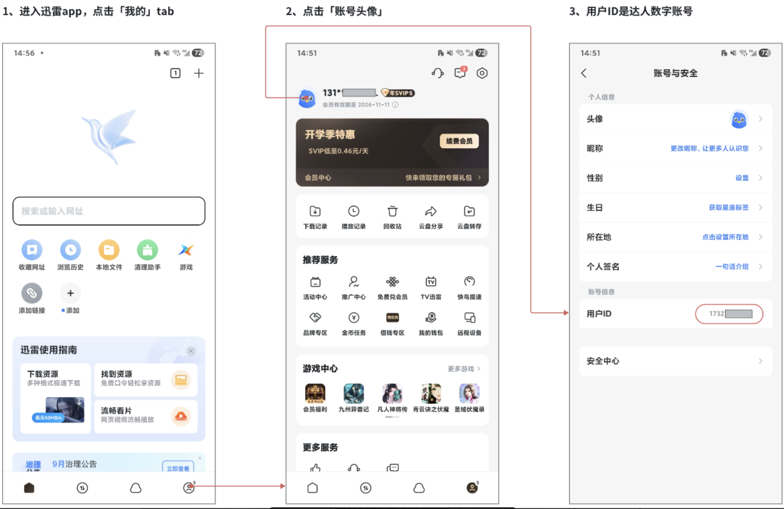 登录迅雷APP,查看迅雷注册绑定的手机号和迅雷ID(即:迅雷数字账号),申请推广时需填写;