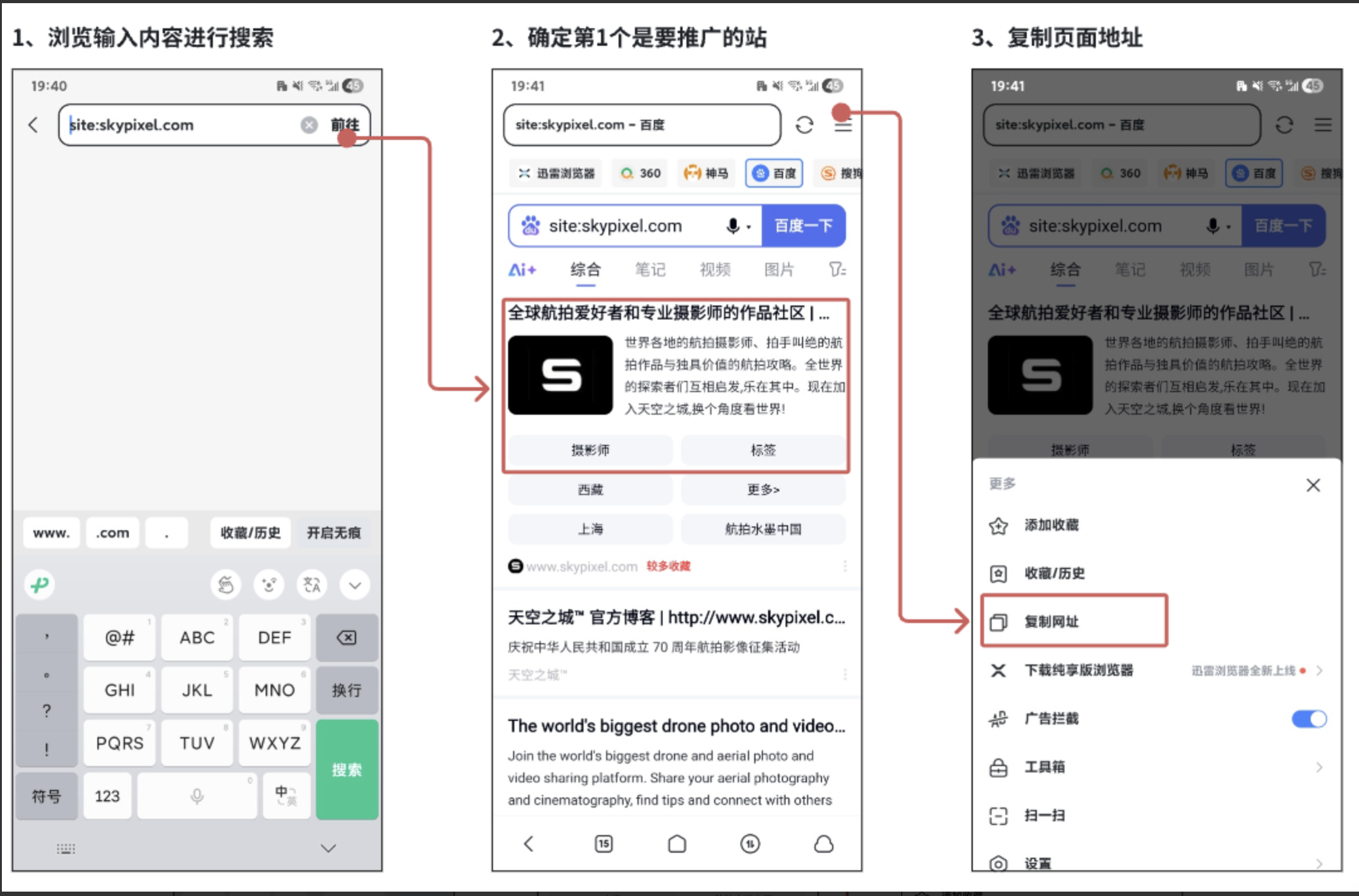 https://m.baidu.com/s?wd=site:skypixel.com,将该网址复制到搜索结果页